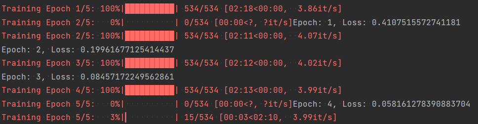 print(f'Epoch: {epoch + 1}, Loss: {avg_train_loss}')在过程中输出Loss函数损失以便于我们观察训练效果: